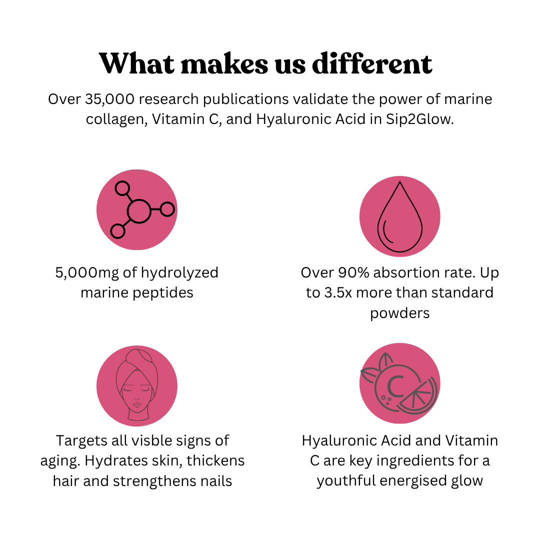 Sip2Glow can be taken directly from the sachet or mixed into water, juice or smoothies. It is recommended to take one serving per day for best results. Consistency is key.